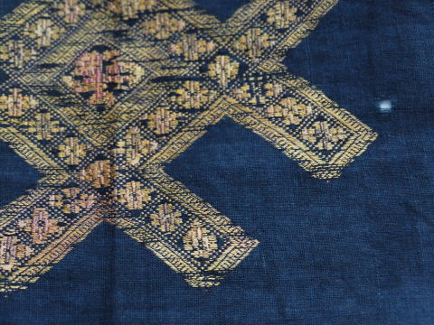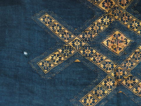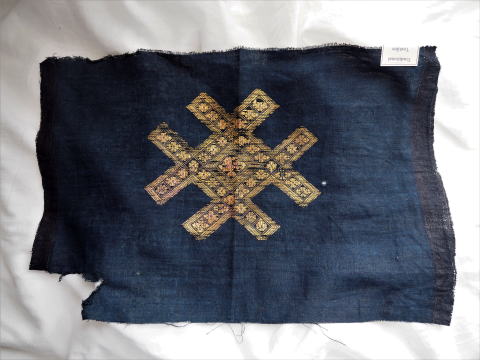 | 貴州省トン族の刺繍です。 赤ちゃんの負ぶい布?それとも衣装? か何かをほどいた刺繍です。 左右の縫われていた部分には藍の色が濃く残っています。 この模様はなんだか「井」の字のように見えますね。 |