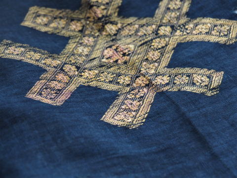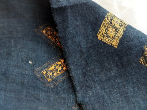 | 近づいてみると、 井の字のなかには小さな正方形が並び、 その中に花が咲いているようです。 風合いの良い細い手つむぎ木綿の藍色に 艶のある黄色い絹糸で刺されています。 うっすらと愛らしいピンクも入っていて、ちっちゃな穴も空いてます。 |