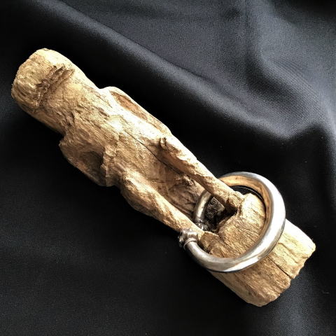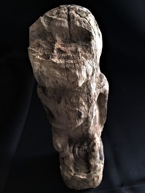| 右手を胸に当て敬意を払っているようです。 正面から見ると人型のようですが、この木彫は鰐を模った祖霊像です。 写真が傾いているのではなくて、この像が傾いています。 本来は土の上に置かれたりするので このくらいの傾きはなんの問題もないのです。 村で傾いていることを指摘すると、反対に不思議がられます。 自然界は有機的ですから。 |